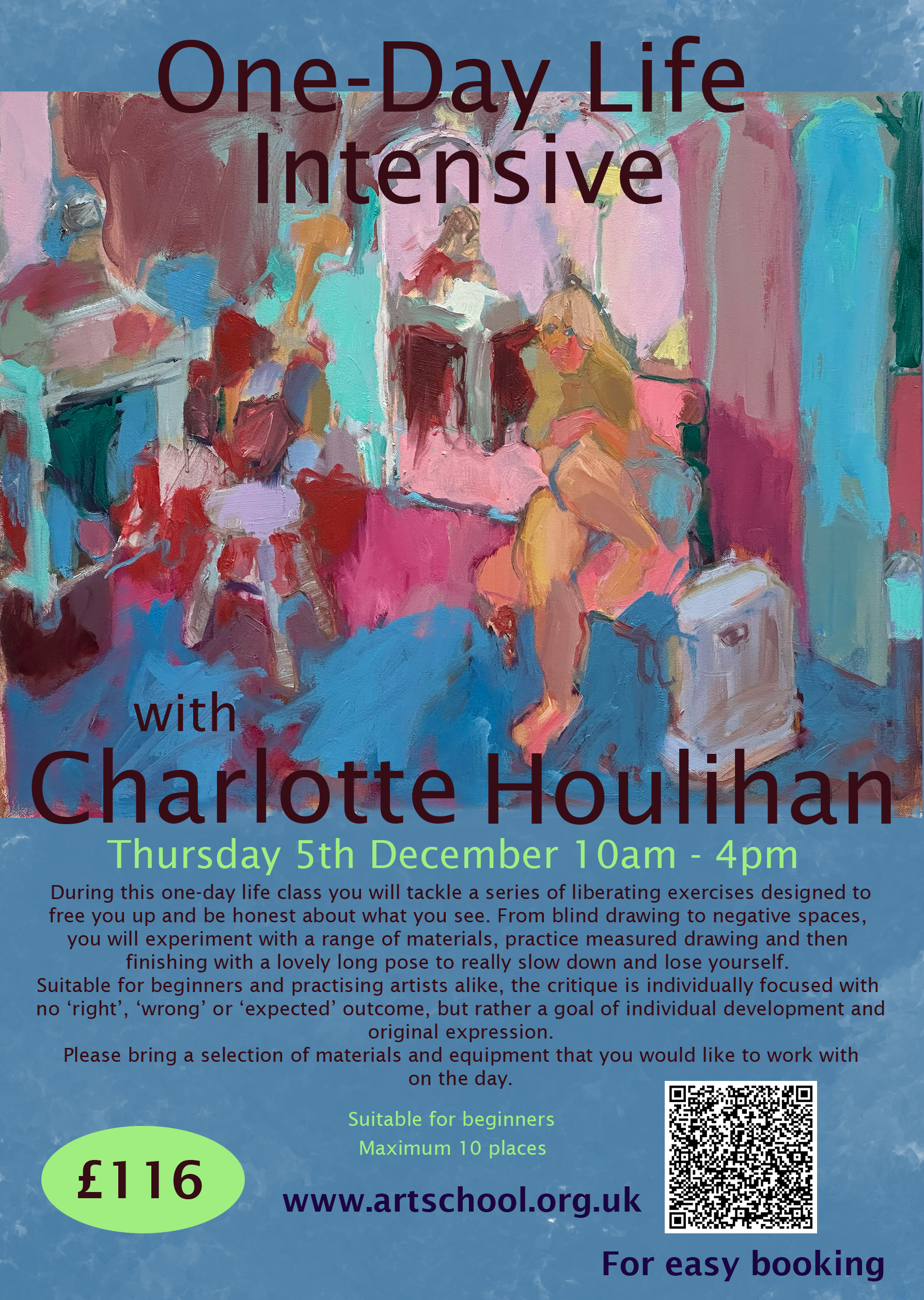 During this one-day life class you will tackle a series of liberating exercises designed to free you up and be honest about what you see. From blind drawing to negative spaces, you will experiment with a range of materials, practice measured drawing and find the model amongst a jumble of furniture, then finishing with a lovely long pose to really slow down and lose yourself. Suitable for beginners and practising artists alike, the critique is individually focused with no ‘right’, ‘wrong’ or ‘expected’ outcome, but rather a goal of individual development and original expression.