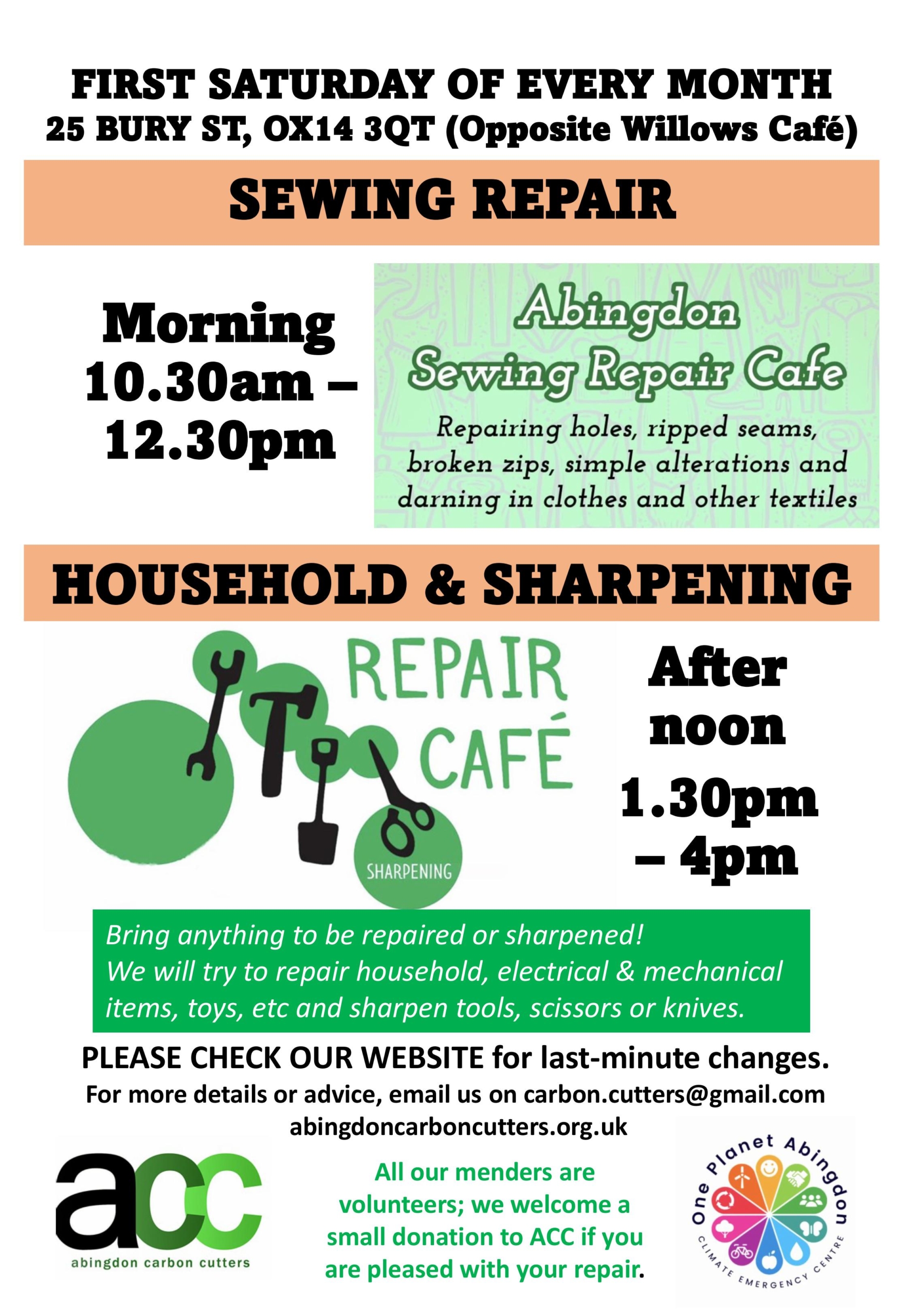 10.30-12.30 Sewing repairs - for mending zips, holes and simple alterations in textiles 1.30-4 General household and electrical repairs. Free, although donations welcome
