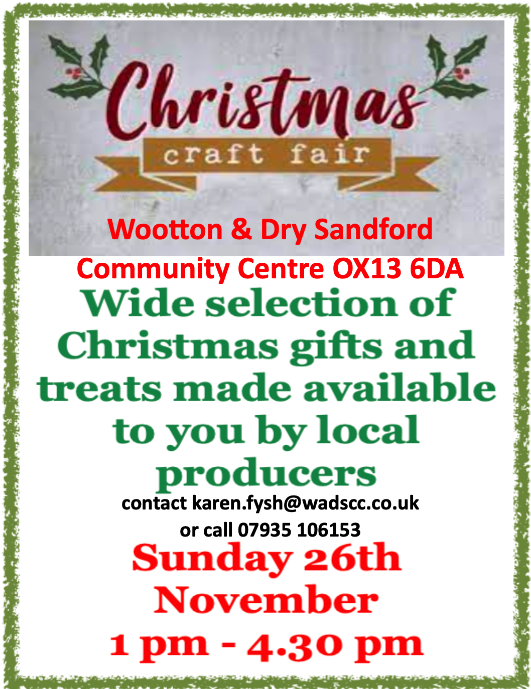 Wootton & Dry Sandford Community Centre OX13 6DA Lamborough Hill, Wootton, OxonMore than 30 stalls selling a selection of festive treats. £1.00 entry under 16s free Refreshments available. Free parking